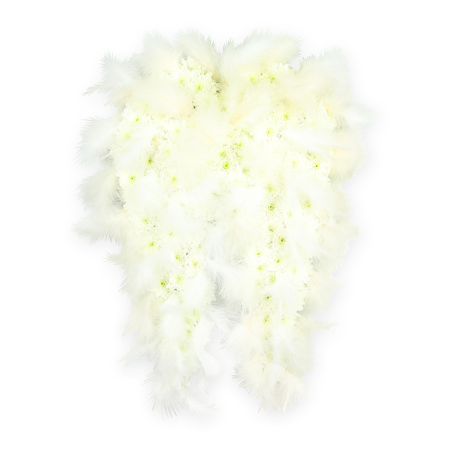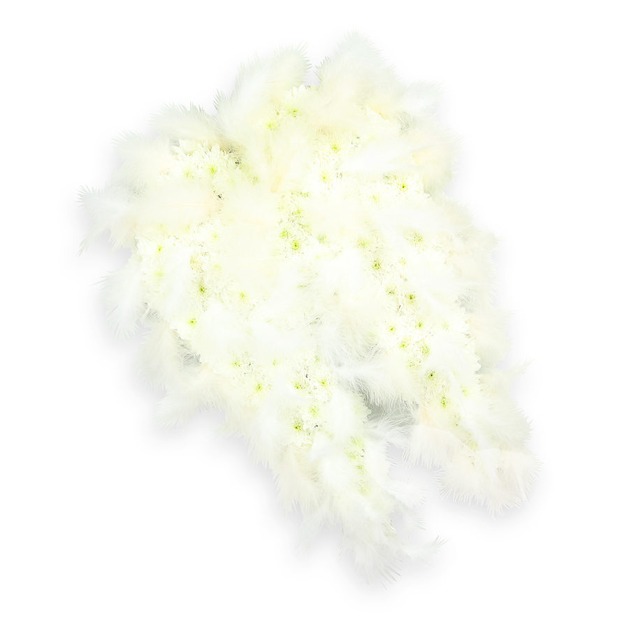 Convey your deepest sympathies with our exquisite and unique flower arrangement. Featuring fresh white chrysanthemums intertwined with delicate white feathers, this bouquet offers a serene and elegant tribute.