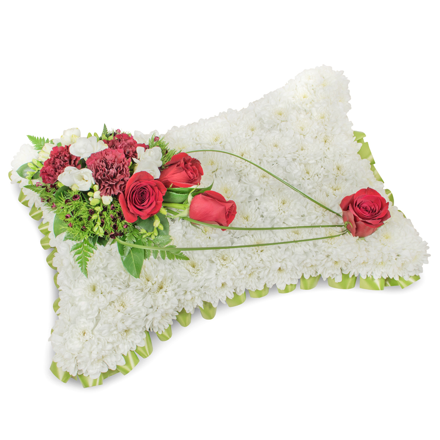 Express your condolences with our beautifully arranged sympathy flowers. This elegant bouquet combines white chrysanthemums, vibrant red roses, fragrant white freesias, and dark red carnations, enhanced by dianthus and bear grass for a unique and thoughtful design.