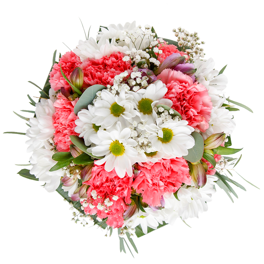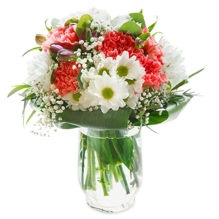 Experience the charm of our hand-curated bouquet that brings a touch of nature's brilliance right to your door. Featuring an enchanting mix of snow-white chrysanthemums, delicate gypsophila, and light pink carnations, accented by lush aspidistra leaves, each arrangement is a symbol of sophistication and care.